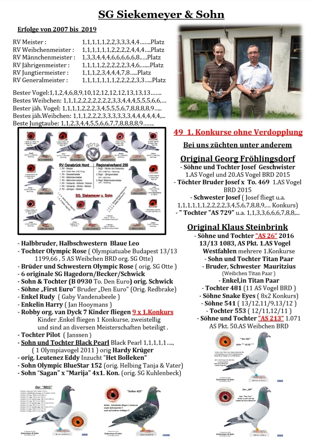Die SG Siekemeyer & Söhne das sind, Vater Rolf Siekemeyer mit seiner Frau Marianne, mein Bruder Jens mit seiner Frau Nicole und ich Torsten mit meiner Freundin Sina.Rolf betreibt den Brieftaubensport schon seit seinem 15 Lebensjahr, er ist immer noch mit Leib & Seele dabei. Wir beiden Söhne fanden nach und nach immer mehr Spaß und Freude am Brieftaubensport, und mittlerweile sind wir schon über 10 Jahre mit vollem Einsatz dabei. Alles hat angefangen in der RV Wittekind, bis wir dann im Jahre 2003 in die RV Osnabrück Nord wechselten, wo wir bis heute eine doch sehr Erfolgreiche Laufbahn genießen können, mit unter anderem den RV Meisterschaften 2008,2009, 2010 und 2012! Mittlerweile ist es so das Jens einen eigenen Reiseschlag in der RV Osnabrück Nord hat,die Zucht wird aber weiter gemeinsam betrieben.